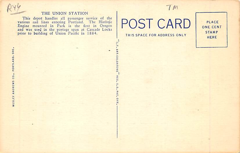 Union Station Portland, Oregon Postcard - View Images Grade: 1 Size: R - Regular Size Postcard - approximately 3 1/2 inch x 5 1/2 inch (9 CM x 14 CM) Grading Scale: Grade 1 = Perfect corners Grade 2 = Very Mini ... Read More