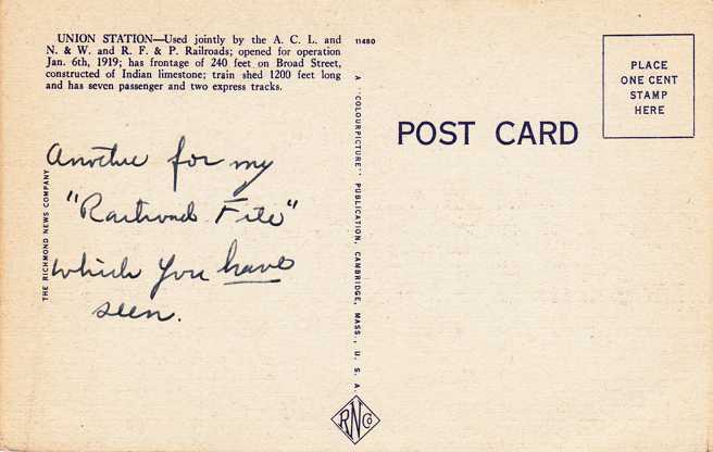 Union Train Station - Richmond, Virginia.Standard sized linen post card.