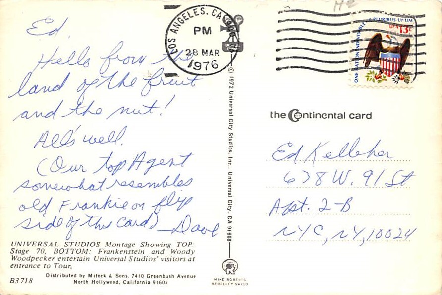 Universal Studios Postcard View Back Image, Grade: 2, , Size: Continental Size Postcard - approximately 4 inch X 6 inch (15 CM X 10.5 CM) Grading Scale: Grade 1 = Perfect corners Grade 2 = Very Minimal corner w ... Read More