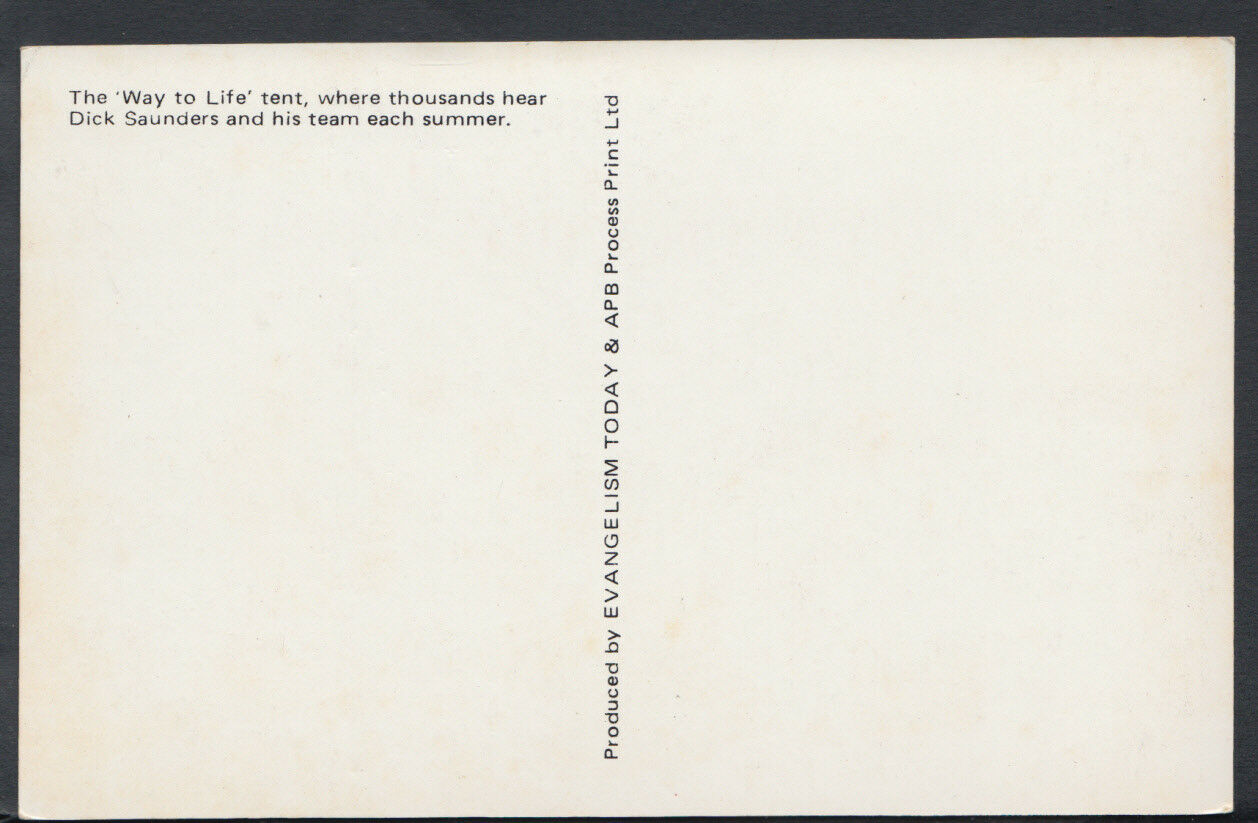 Postcard Description: Unknown Location Postcard - Evangelism Today - The 'Way To Life' Tent, Where Thousands Hear Dick Saunders and His Team Each Summer