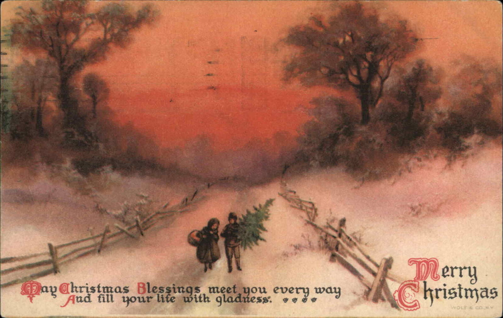 Unsigned Clapsaddle Children w Christmas Tree on Snowy Road Wolf Pub