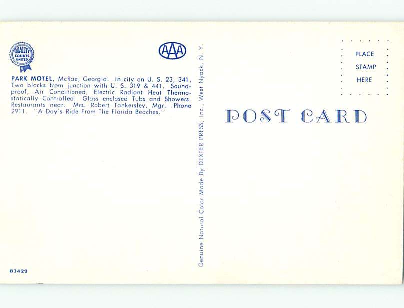 Unused 1950's PARK MOTEL Mcrae Georgia GA s3578