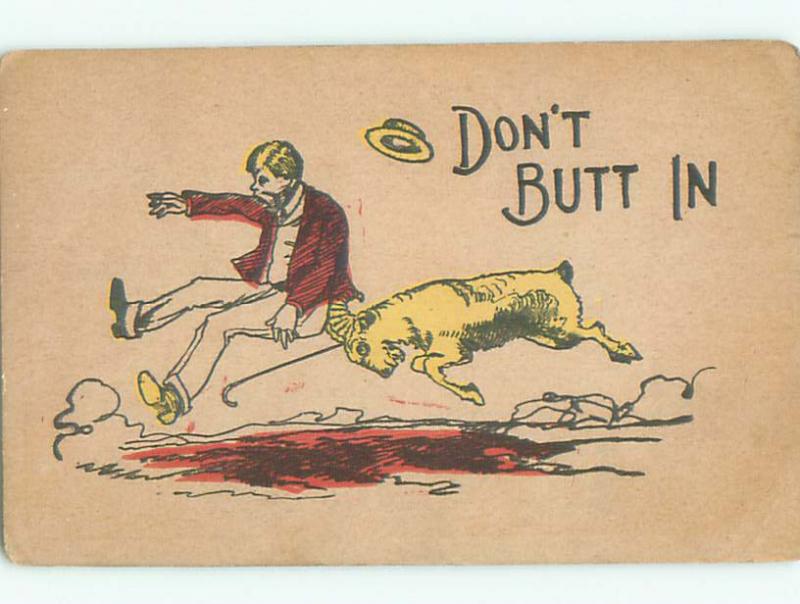 Unused Pre-1907 comic DON'T BUTT IN - GOAT RAMS MAN IN BUTT k6813