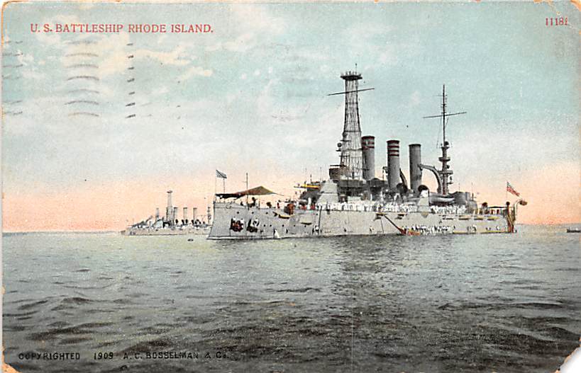 US Battleship Rhode Island Postcard 1916, Grade: 5 - missing bottom right corner, postal marking on front, , Size: Regular Size Postcard - approximately 3 1/2 inch x 5 1/2 inch (9 CM x 14 CM) Grading Scale: Gra ... Read More
