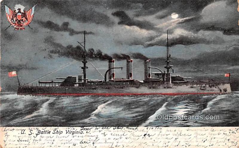 US Battleship Virginia Postal Date: 1906 Grade: 3 Size: Regular Size Postcard - approximately 3 1/2 inch x 5 1/2 inch (9 CM x 14 CM) Grading Scale: Grade 1 = Perfect corners Grade 2 = Very Minimal corner wear ... Read More