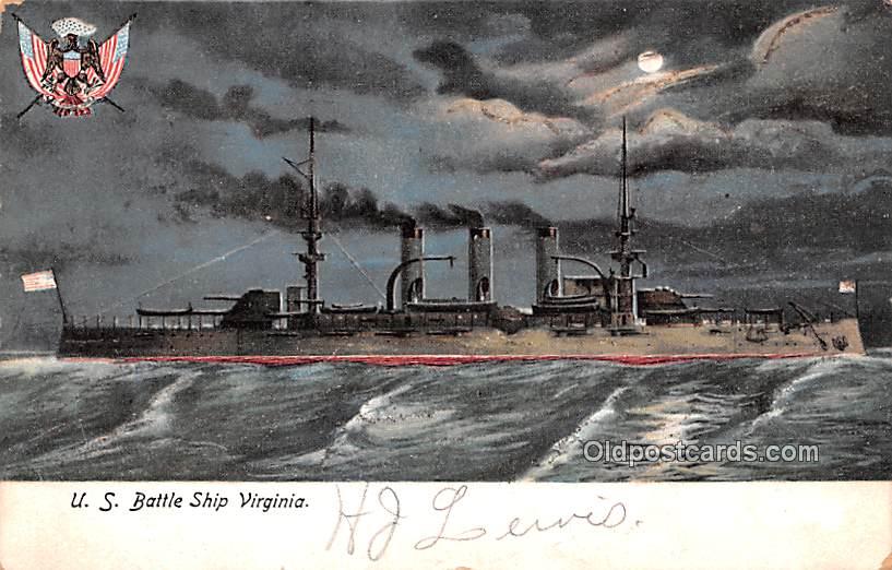 US Battleship Virginia Postal Date: 1906 Grade: 3 Size: Regular Size Postcard - approximately 3 1/2 inch x 5 1/2 inch (9 CM x 14 CM) Grading Scale: Grade 1 = Perfect corners Grade 2 = Very Minimal corner wear ... Read More