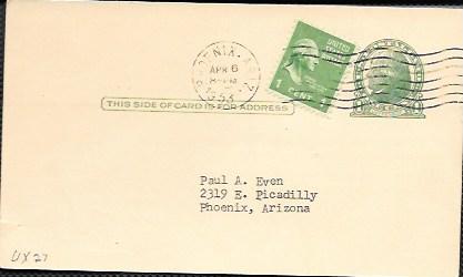 Here is a UX27 Jefferson postcard. Card mailed from Phoenix, AZ on April 6, 1953. Needed an extra one cent stamp, so there is a nice Washington #804. Very nice.