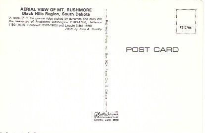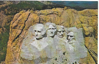 Nice Card - South Dakota. Aerial view of Mt. Rushmore, Black Hills Region. Here they are - Washington, Jefferson, Roosevelt, and Lincoln. God, Bless America. Please.