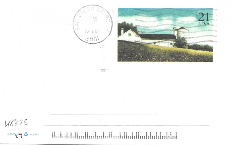 US UX375. Used postcard. White Barn, 2000. God Bless America. Please.
