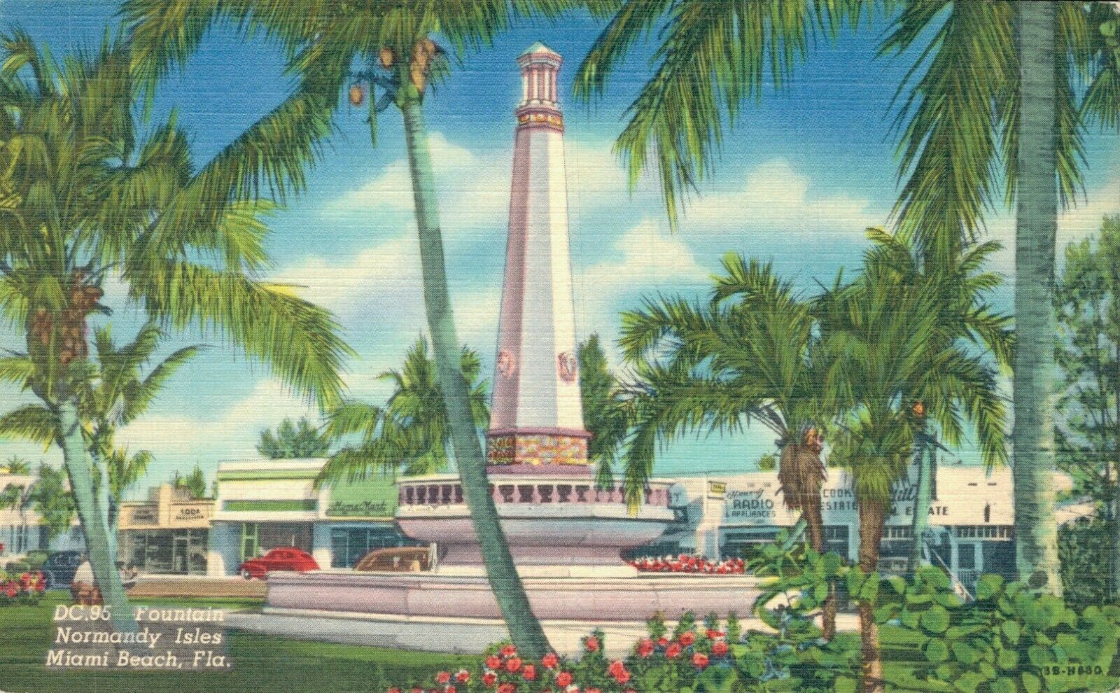 USA Fountain Normandy Isles Miami Beach Linen Postcard 03.58