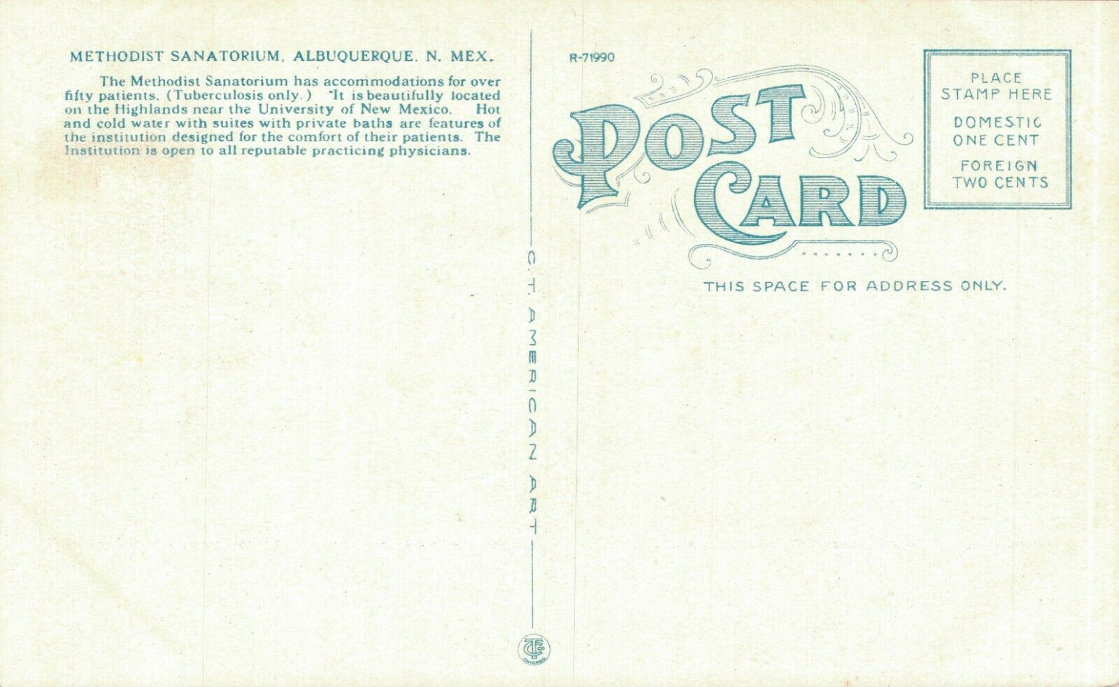 USA Methodist Sanatorium Tuberculosis Albuquerque New Mexico Postcard 07.19