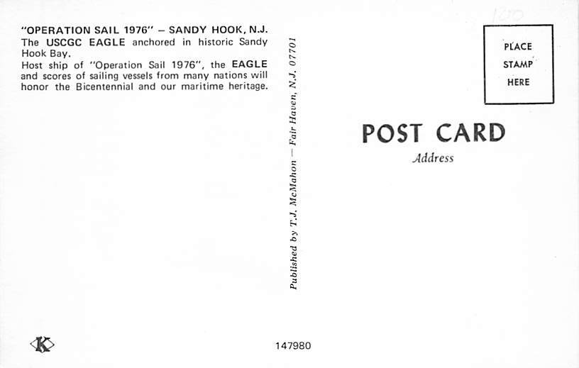 USCGC Eagle Operation Sail 1976 USCGC Eagle, Sail Boats Postcard View image, Grade: 1, , Size: Regular Size Postcard - approximately 3 1/2 inch x 5 1/2 inch (9 CM x 14 CM) Grading Scale: Grade 1 = Perfect corne ... Read More