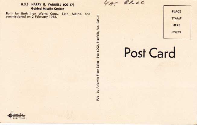 USS Harry E Yarnell (CG-17). Guided Missile Cruiser. Commissioned on February 2, 1963. Standard sized chrome card. Excellent condition.
