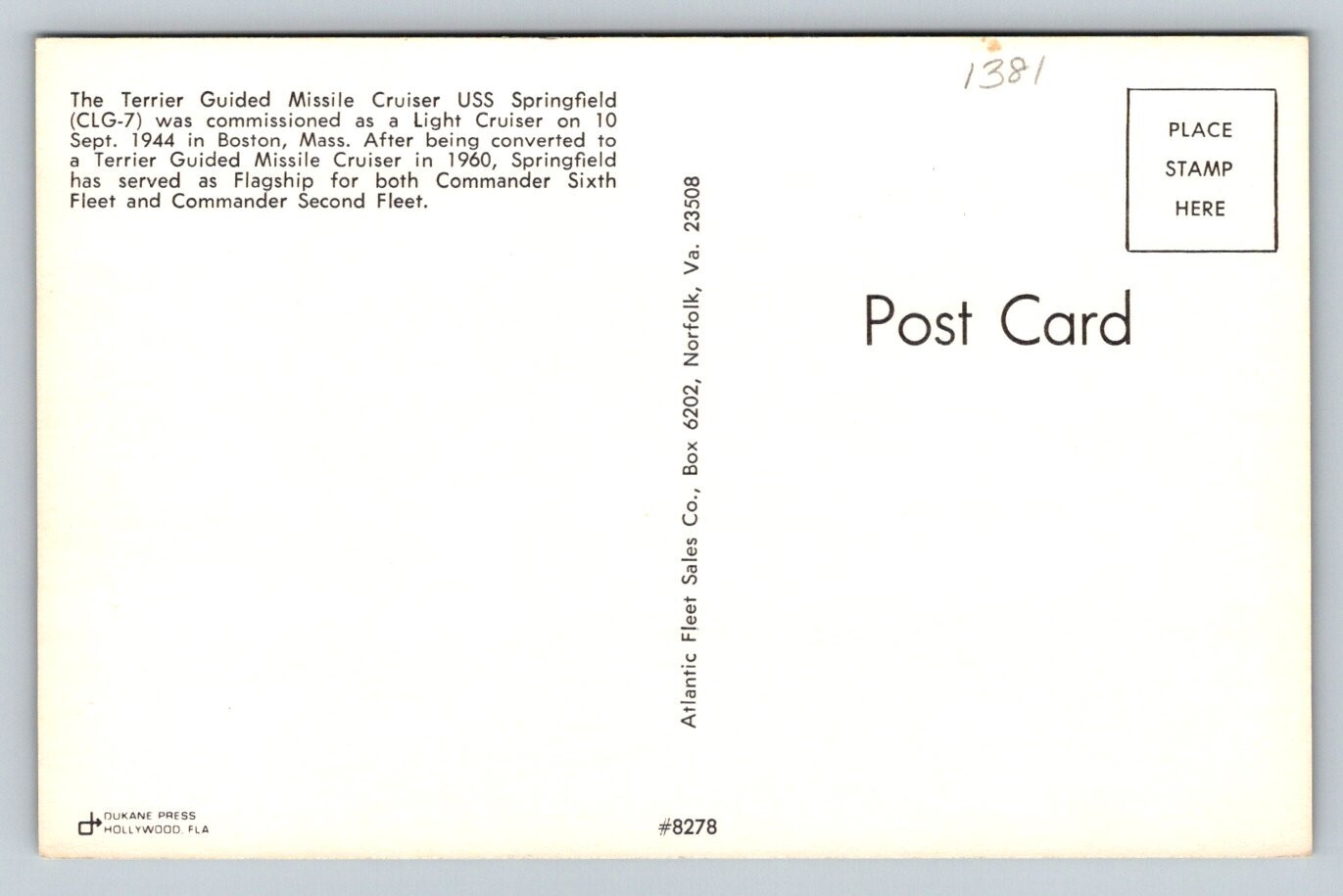 USS Springfield CLG-7 US Navy Guided Missle Cruiser Postcard
