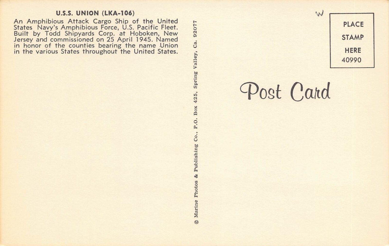 USS Union LKA-106 US Navy Amphibious Attack Cargo Ship postcard