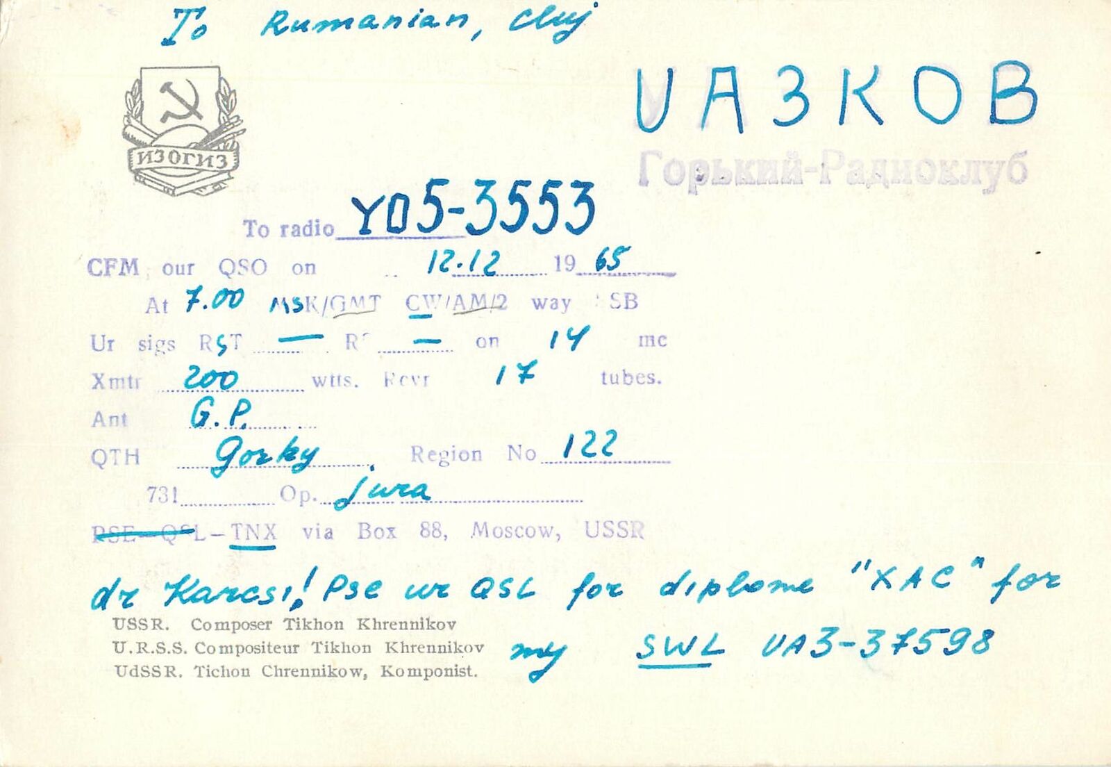 USSR composer Postcard Thikon Khrennikov