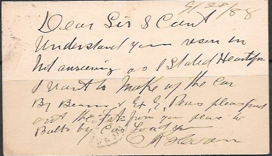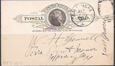 Post card # UX9, Issued in 1888. This card was sent from Baltimore, Maryland to Jefferson, New York on September 28, 1888. Note on back side.