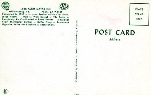 VA - Williamsburg. Lord Paget Motor Inn Nm, Un, Db, C Grading of Postcards MINT (M): Perfect condition, no apparent blemishes, flaws, postally unused, may have some writing on back. NEAR MINT (NM): Like new, image ... Read More