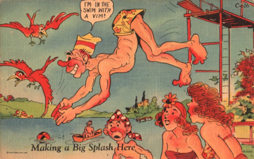It's not just our hero, in the swim with a vim, and his high fashion outfit; it's the faces of the onlookers. A Teich postcard of the 1940s or thereabouts, never mailed or messaged and in excellent condition