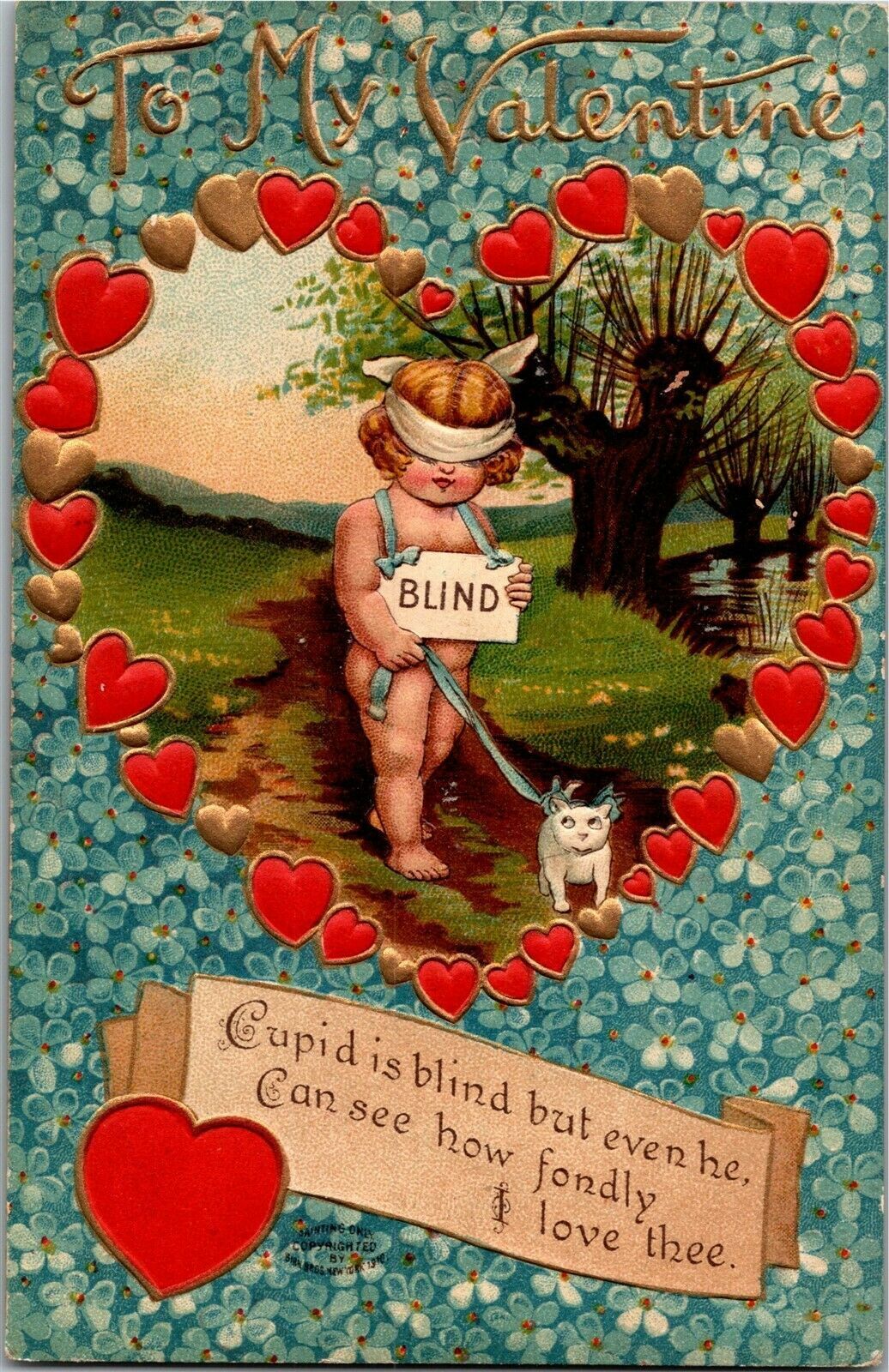 Valentine Embossed, Cupid is Blind, Blindfolded Vintage Postcard D79
