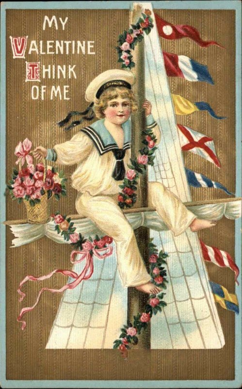 VALENTINE Little Boy Sailor on Rigging MULTIPLE FLAGS Embossed c1910 PC
