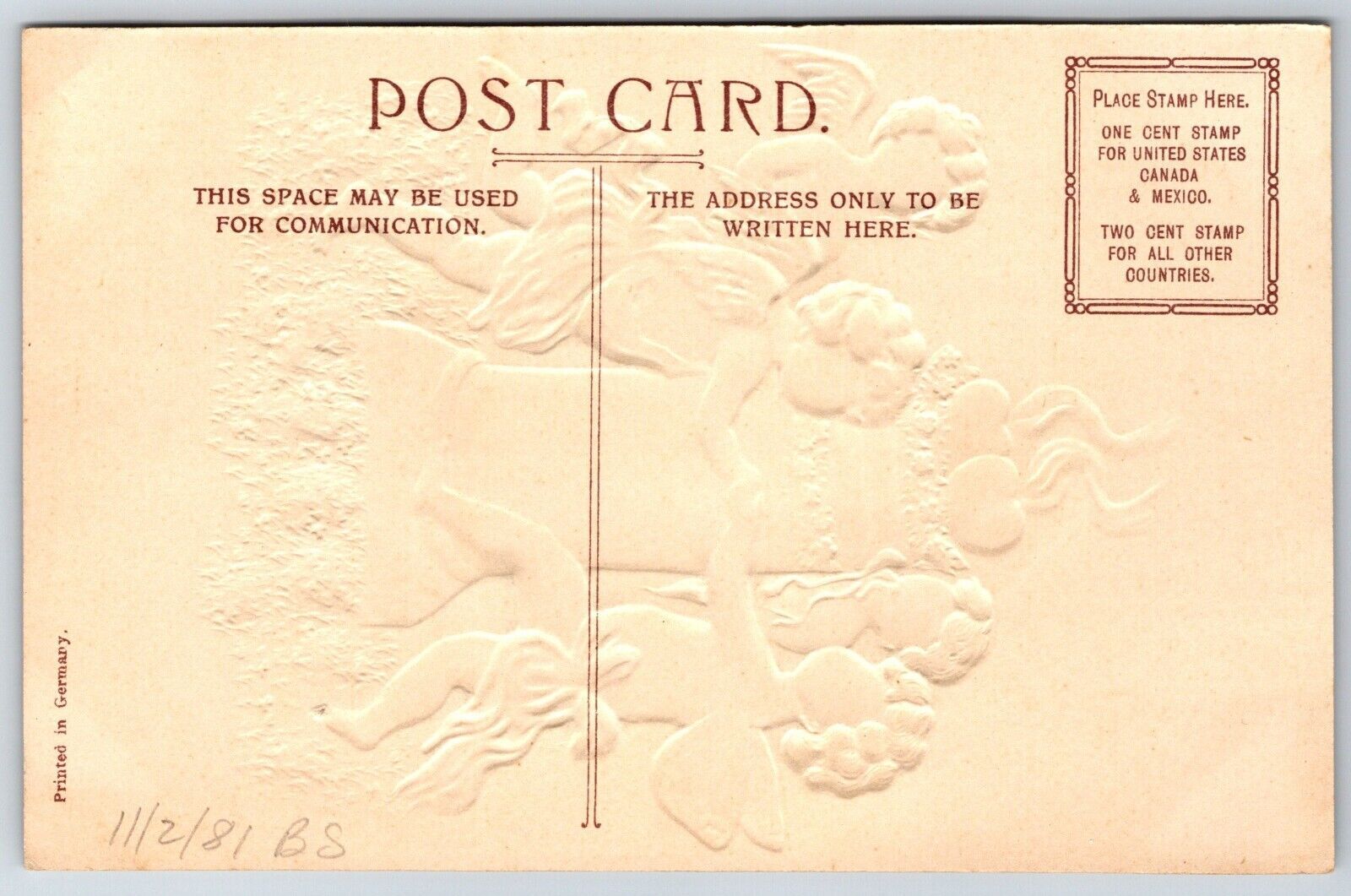 Valentine~4 Cupids Dance Around 2 Hearts Burning On Pillar~Emboss~Germany~c1910