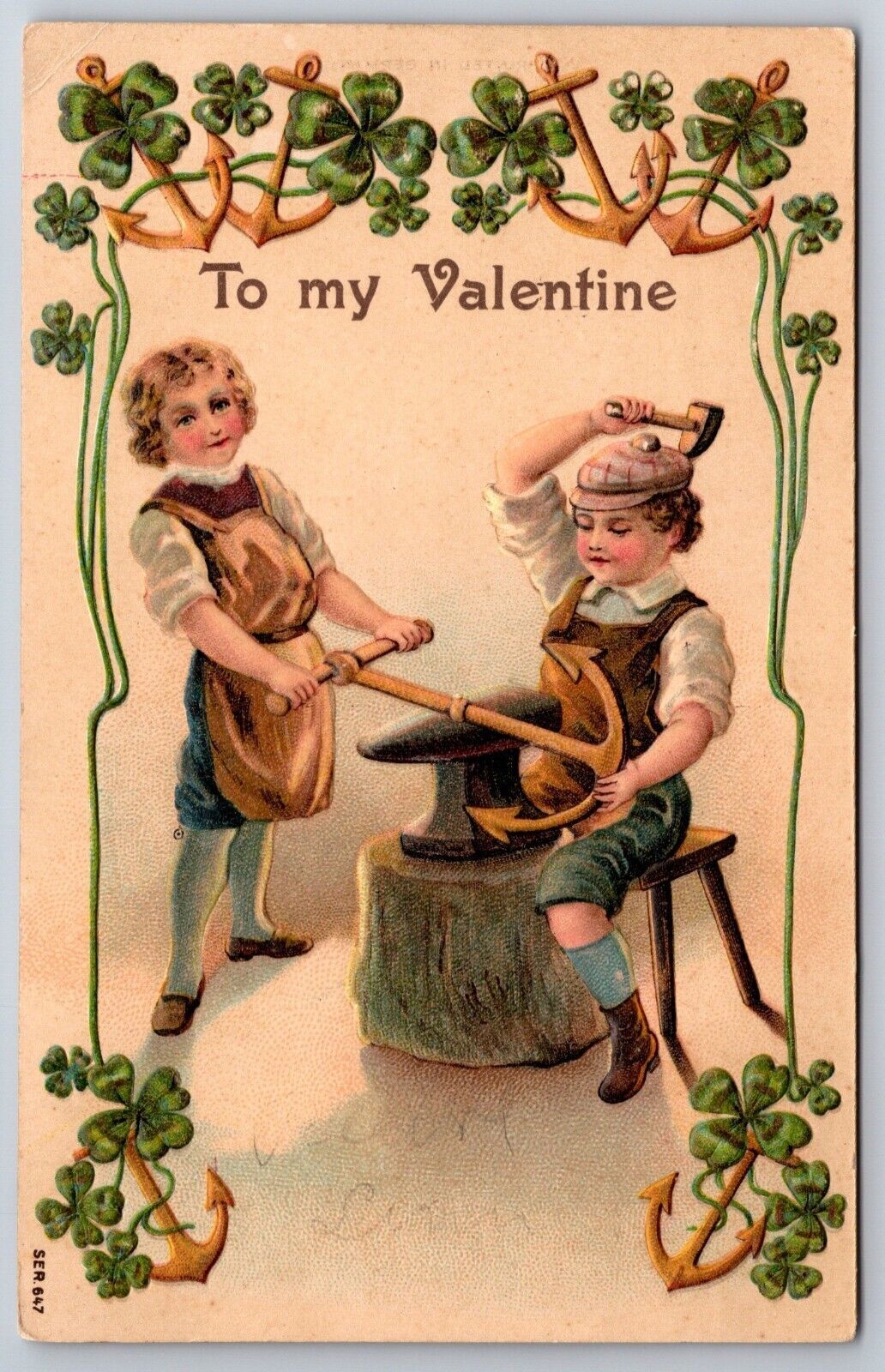 Valentine~Blacksmith & Helper Hammer Anchors~Shamrocks~Embossed~Germany~c1910