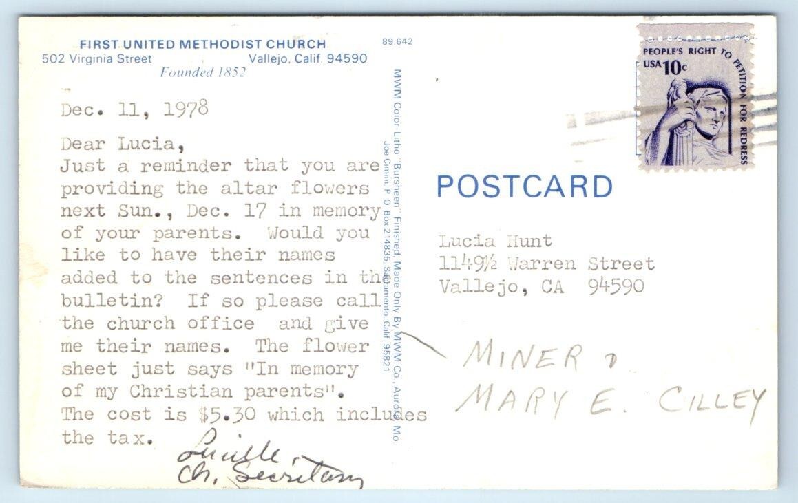 VALLEJO, CA California ~ First United METHODIST CHURCH 1978 Postcard