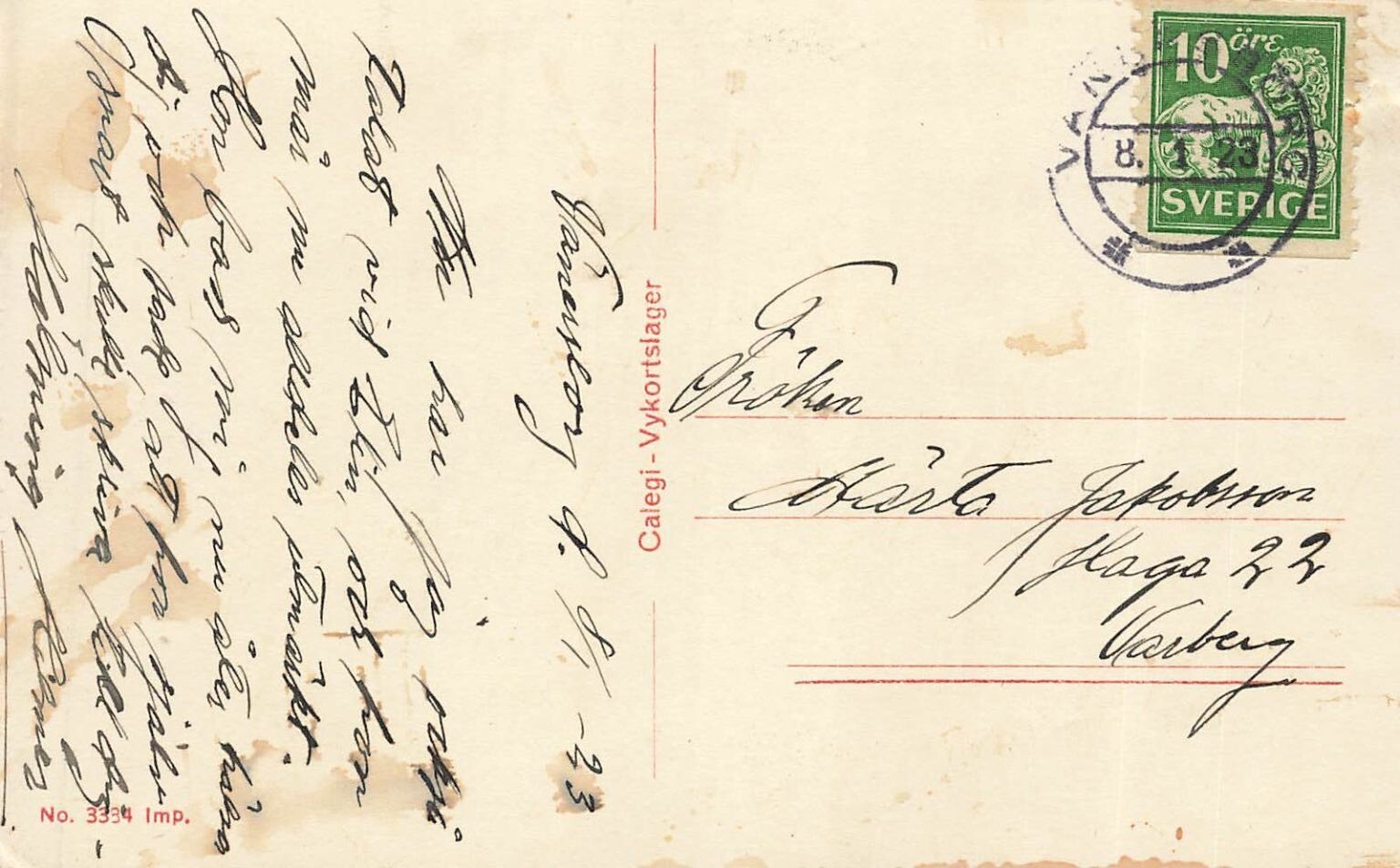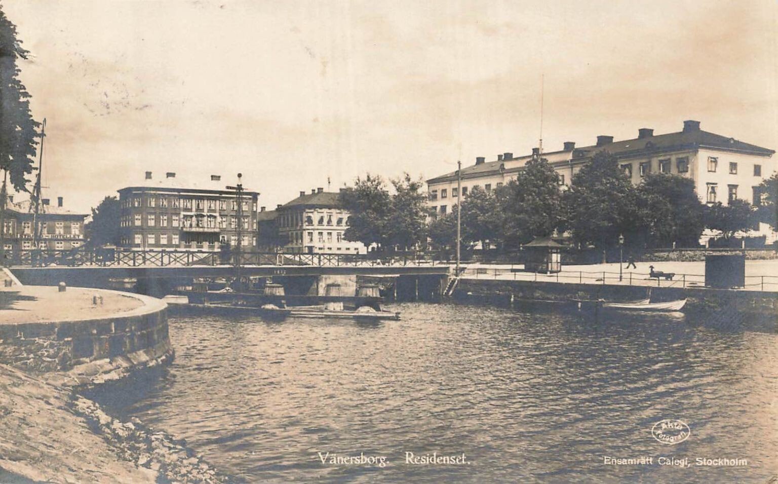 Discover a captivating vintage postcard showcasing Vänersborg, Sweden, featuring the historic Residenset (Governor's Residence) along a serene waterway. This evocative sepia-toned image, reminiscent of a real photo postcard, captures the architectural elegance and tranquil charm of the Swedish city in the early 20th century. The detailed scene includes a bridge spanning the water, with several boats gently moored, reflecting a bygone era of Scandinavian urban life and transportation. The renowned publisher Calegi, identified by the "Ensamrätt Calegi, Stockholm" marking and "AKTA FOTOGRAFI" (Genuine Photography) logo, produced this quality piece, making it a desirable item for collectors of Swedish ephemera and historical photography.This collectible postcard offers a tangible glimpse into Vänersborg's past, illustrating its picturesque canal and significant landmarks. The reverse side bears a crisp 1923 postmark from Vänersborg, confirming its historical context and use. A 10 öre Sverige stamp is affixed, adding to its authentic vintage appeal. The handwritten message and address to Varberg further personalize this piece, providing a unique connection to its original journey and the communication styles of the period. This postcard is a wonderful addition for enthusiasts of Swedish history, vintage travel, and early 20th-century European cityscapes.