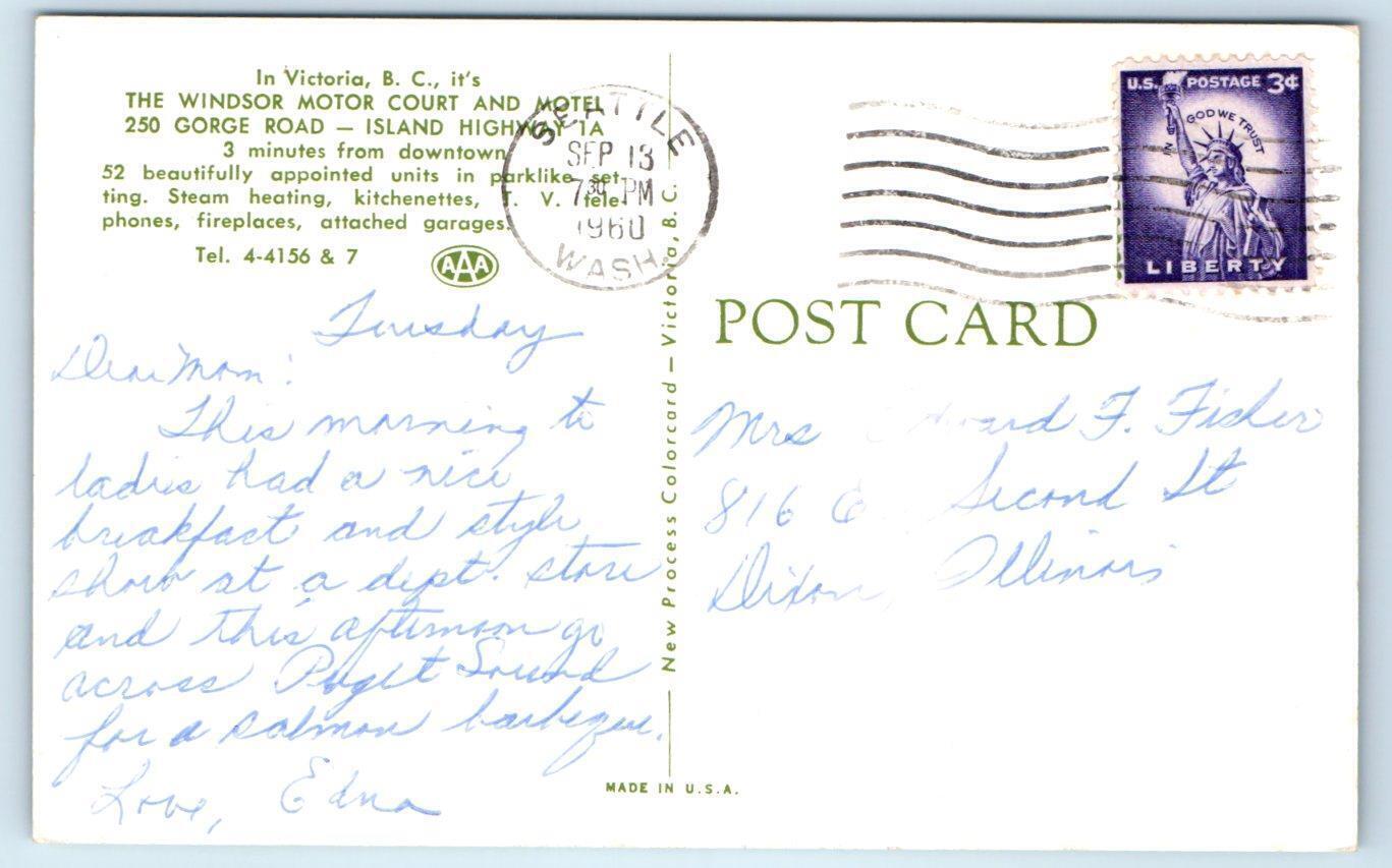 VICTORIA, B.C. Canada ~ Roadside WINDSOR MOTOR COURT MOTEL 1960 Postcard