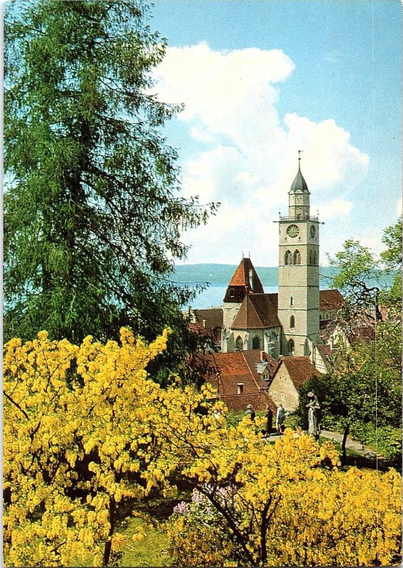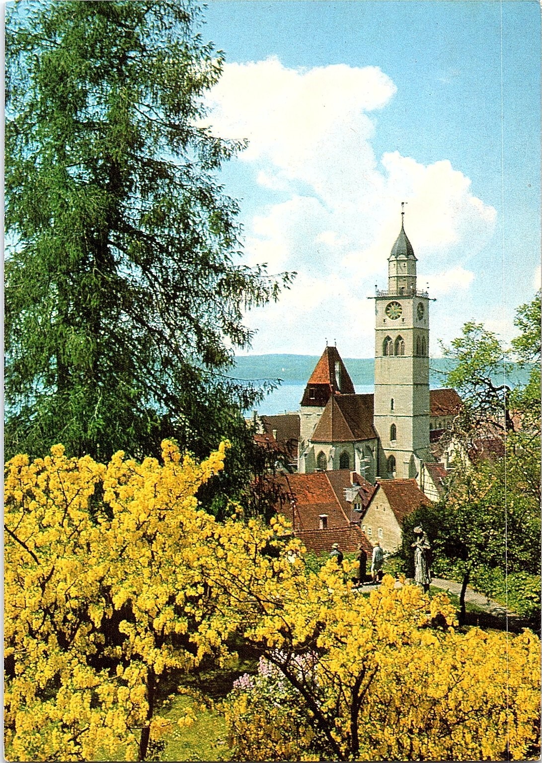 This charming vintage postcard showcases the picturesque view of St. Nikolausmünster from the Museum Garden in Überlingen, located on the scenic Bodensee (Lake Constance) in Germany. The image highlights vibrant yellow flowering trees in the foreground, with the historic church and clock tower standing prominently against a bright blue sky dotted with clouds. In the background, the tranquil waters of Lake Constance add to the postcard's serene appeal.This postcard features a divided back format and is printed on paper material sized approximately 6 x 4 inches (Continental). It is a photo postcard by the publisher Foto Lauterwasser, Überlingen/Bodensee, known for capturing iconic German landscapes and landmarks. This collectible piece offers a glimpse into the historical and cultural heritage of the Bodensee region with its detailed photographic quality and classic postcard design.