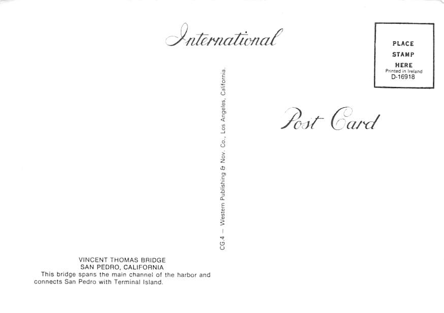 Vincent Thomas Bridge - San Pedro, California Grade: 1 Category: Continental Size Postcard, Approx 4 in x 6 in (10 cm x 15.25 cm) Product Size: Continental size: 4X6 inches (10.5 cm x 15 cm) Grading Scale: Gra ... Read More