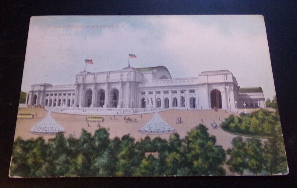Vintage penny postcard - 1909 used - union station, washington d.C. Please check the photo for the actual postcard you will receive.Thanks for looking.***please be aware the Hip standard shipping will be shipped in a plain white envelope with no protection except a soft postcard sleeve with an index card on each side ( item could get damaged in shipping) and no tracking available**