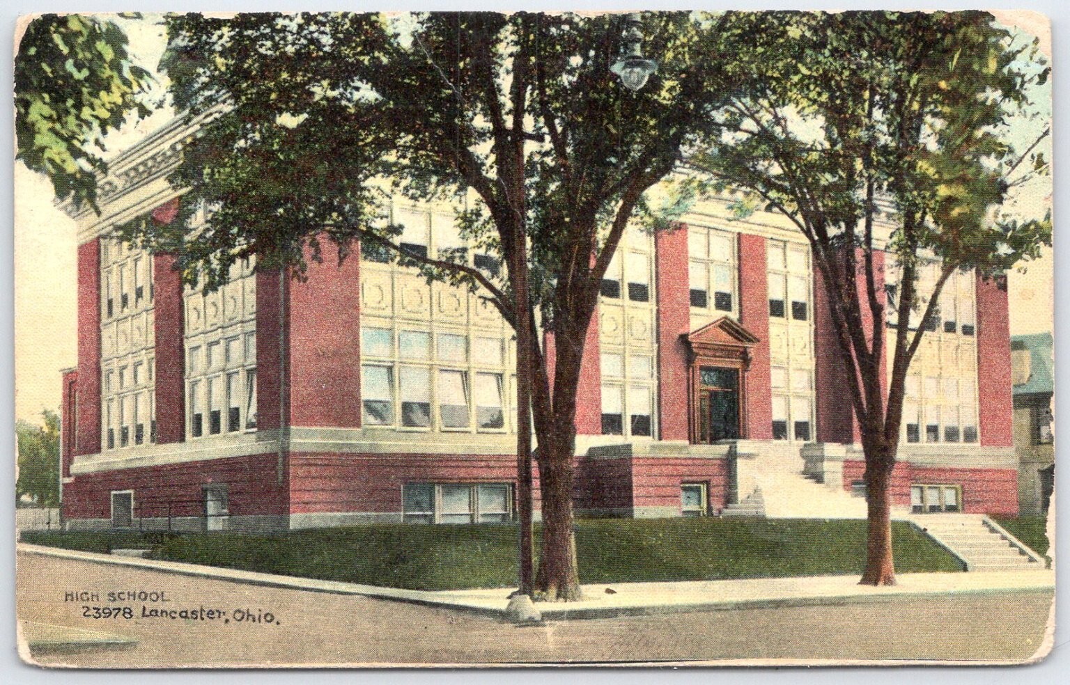 Discover a piece of early 20th-century history with this captivating postcard featuring the High School in Lancaster, Ohio. The image showcases the grand architectural presence of the school building, characterized ... Read More