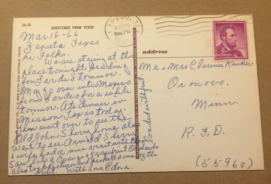 VINTAGE 1966 USED POSTCARD GREETINGS FROM TEXAS