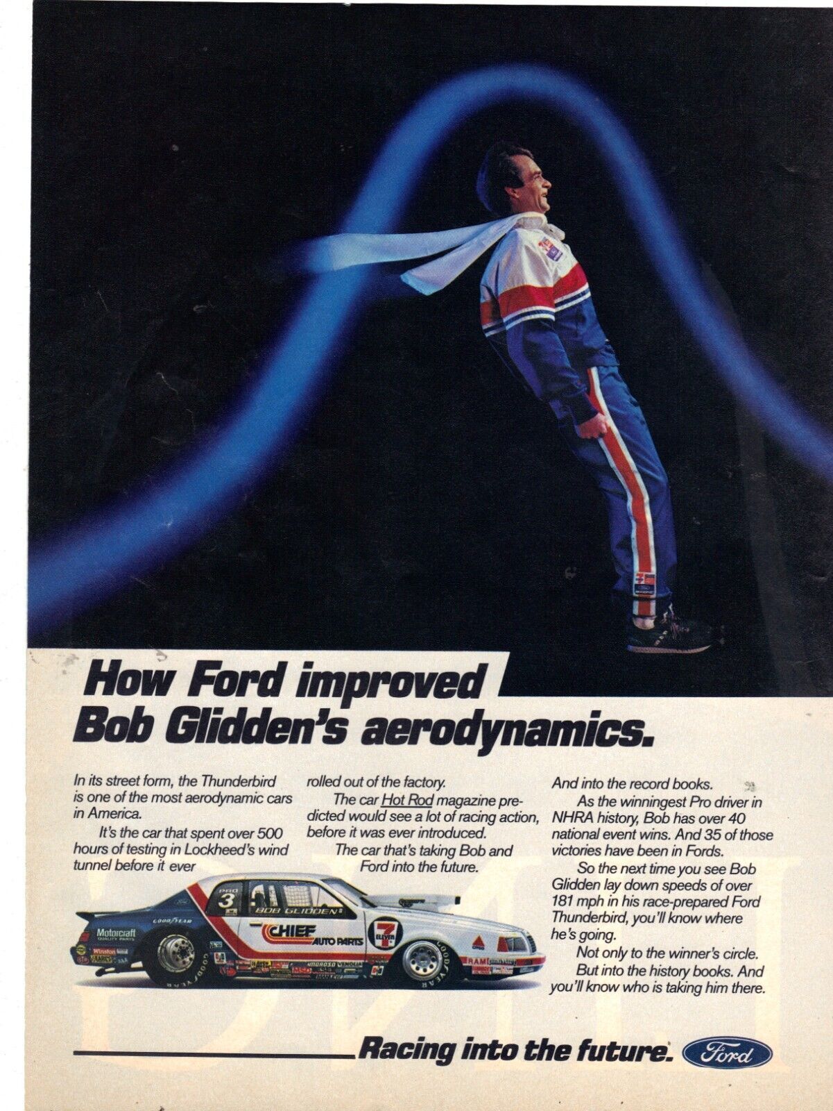 Vintage 1985 Print Ad for Ford Thunderbird with Bob Glidden