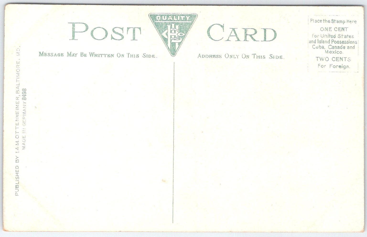 This vintage postcard features a detailed color illustration of the historic Western High School building in Baltimore, Maryland. The striking red brick structure is depicted with distinctive architectural elements including rounded turrets and arched windows, surrounded by lush trees. The postcard captures the classic late 19th to early 20th-century design typical of academic institutions of that era.Published by Y. & M. Ottenheimer, Baltimore, this postcard was made in Germany and boasts the quality hallmark of the publisher, known for producing well-crafted postcards in the early 1900s. The card is a standard size of approximately 5.5 x 3.5 inches, typical of postcards from that period. Its back is divided with clear instructions for message and address placement, and postage rates reflect early 20th-century U.S. postal fees. This collectible postcard is a charming piece of Baltimore history and architectural heritage, ideal for collectors of vintage American postcards or those interested in historic educational buildings.