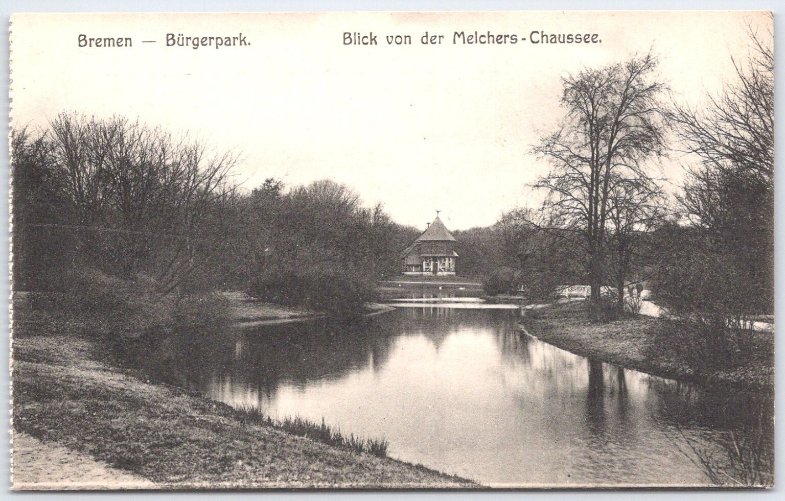 This vintage postcard features a serene black and white view of Bürgerpark in Bremen, Germany, looking from Melchers-Chaussee. The image captures a tranquil pond reflecting surrounding bare trees and a charming pavilion structure in the background, showcasing early 20th century park architecture and landscape design in northern Germany. The peaceful scene evokes a nostalgic glimpse into Bremen's historic green spaces.Printed by Verlag G. A. Pöricke, Bremen, this postcard is part of a numbered series (No. 511). It is a standard size postcard measuring approximately 5.5 x 3.5 inches and printed on quality paper typical of early 1900s German postcards. The back is divided for correspondence and address, following classic postcard formats. Collectors of German cityscapes, vintage European postcards, or historical park imagery will appreciate this authentic piece of Bremen's cultural heritage.