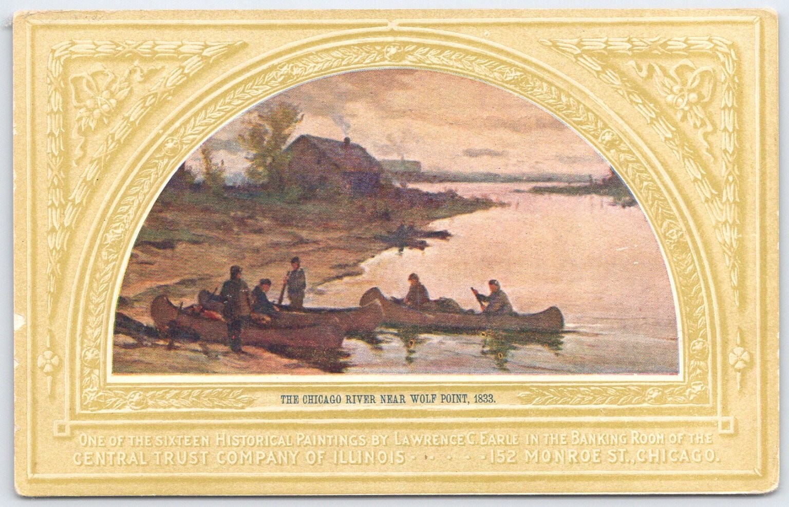 This vintage postcard features a historic painting titled "The Chicago River Near Wolf Point, 1833" by Lawrence C. Earle. The artwork captures an early scene of the Chicago River with figures in canoes along the riverbank, evoking the city's pioneer era. The postcard is one of sixteen historical paintings displayed in the banking room of the Central Trust Company of Illinois, located at 152 Monroe Street, Chicago.The postcard is printed on standard paper measuring approximately 5.5 x 3.5 inches and is framed with an embossed decorative border that enhances its collectible appeal. This piece offers a glimpse into Chicago's early development and is ideal for collectors interested in historical art, Americana, or Chicago landmarks. It remains an original, unposted postcard, perfect for display or adding to a vintage postcard collection.