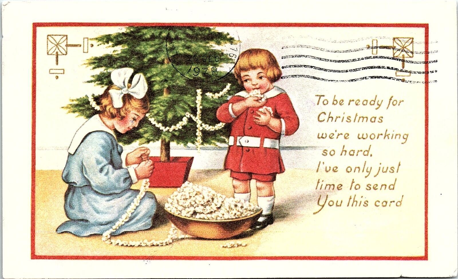 VINTAGE CHRISTMAS CHILDREN STRINGING POPCORN REISSUE POSTCARD 39-304