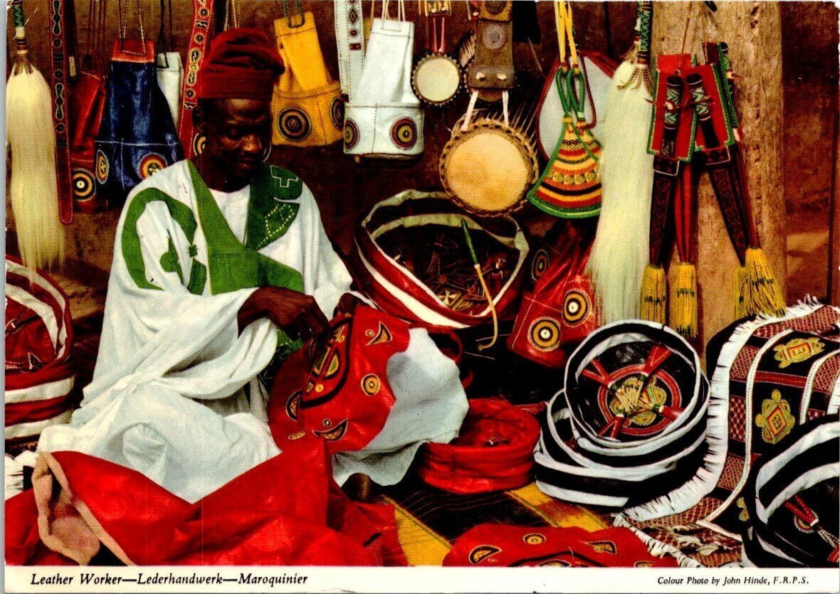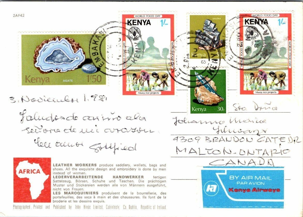 VINTAGE CONTINENTAL SIZE POSTCARD LEATHER WORKER MAILED FROM KENYA 1981