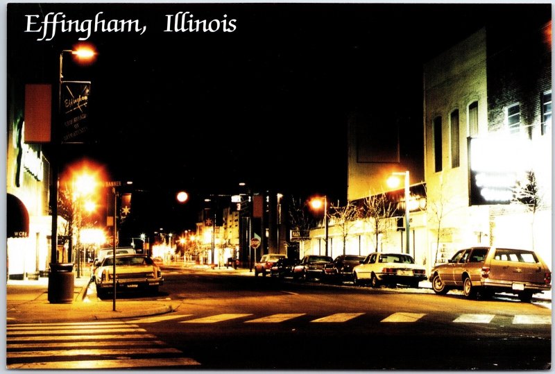 VINTAGE CONTINENTAL SIZE POSTCARD STREET SCENE AT NIGHT AT EFFINGHAM ILLINOIS