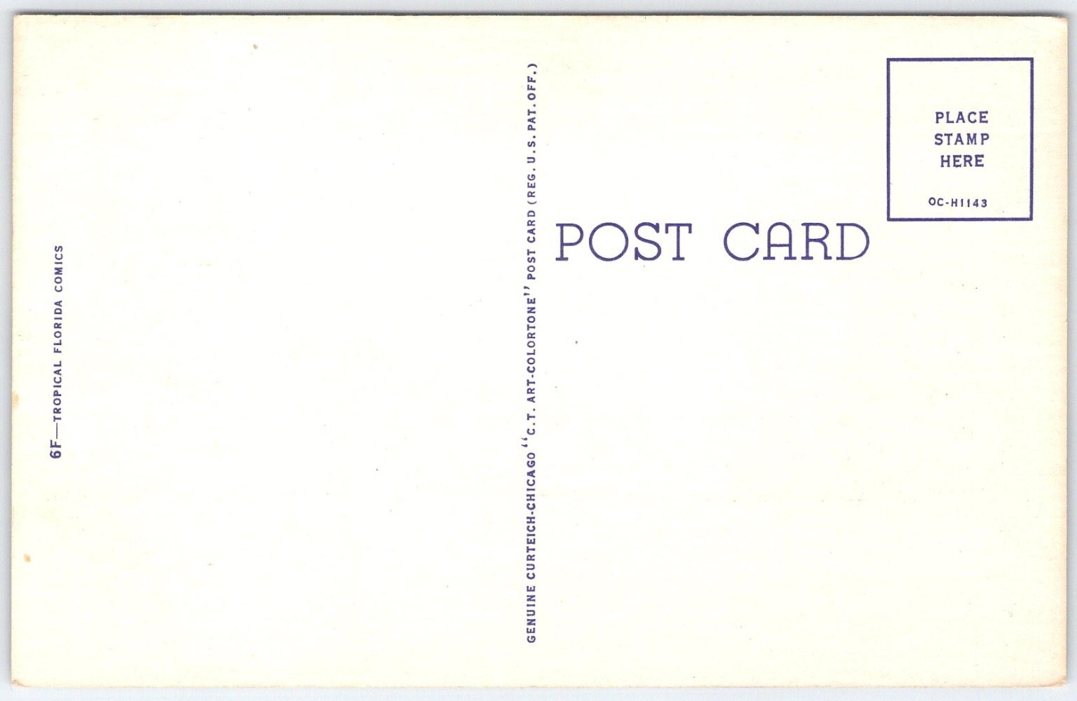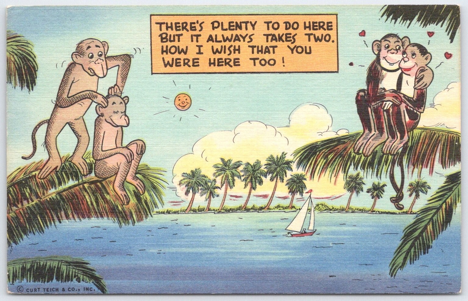This charming vintage postcard features a whimsical cartoon scene of four monkeys on tropical palm trees overlooking a tranquil body of water with a small sailboat. The colorful illustration conveys a playful message: "There's plenty to do here but it always takes two. How I wish that you were here too!". The bright, cheerful colors and detailed line work are typical of Curt Teich & Co.'s iconic Mid-Century postcard art style.Produced by Curt Teich & Co., Inc., a renowned Chicago-based publisher known for high-quality printed postcards, this piece is part of the Tropical Florida Comics series (6F). Printed using the patented C.T. Art-Colortone process, the postcard delivers vivid hues and crisp imagery on standard size paper measuring approximately 5.5 x 3.5 inches. This collectible postcard captures the playful spirit of Florida's tropical ambiance with a humorous twist, making it a delightful addition to any vintage postcard or comic postcard collection.