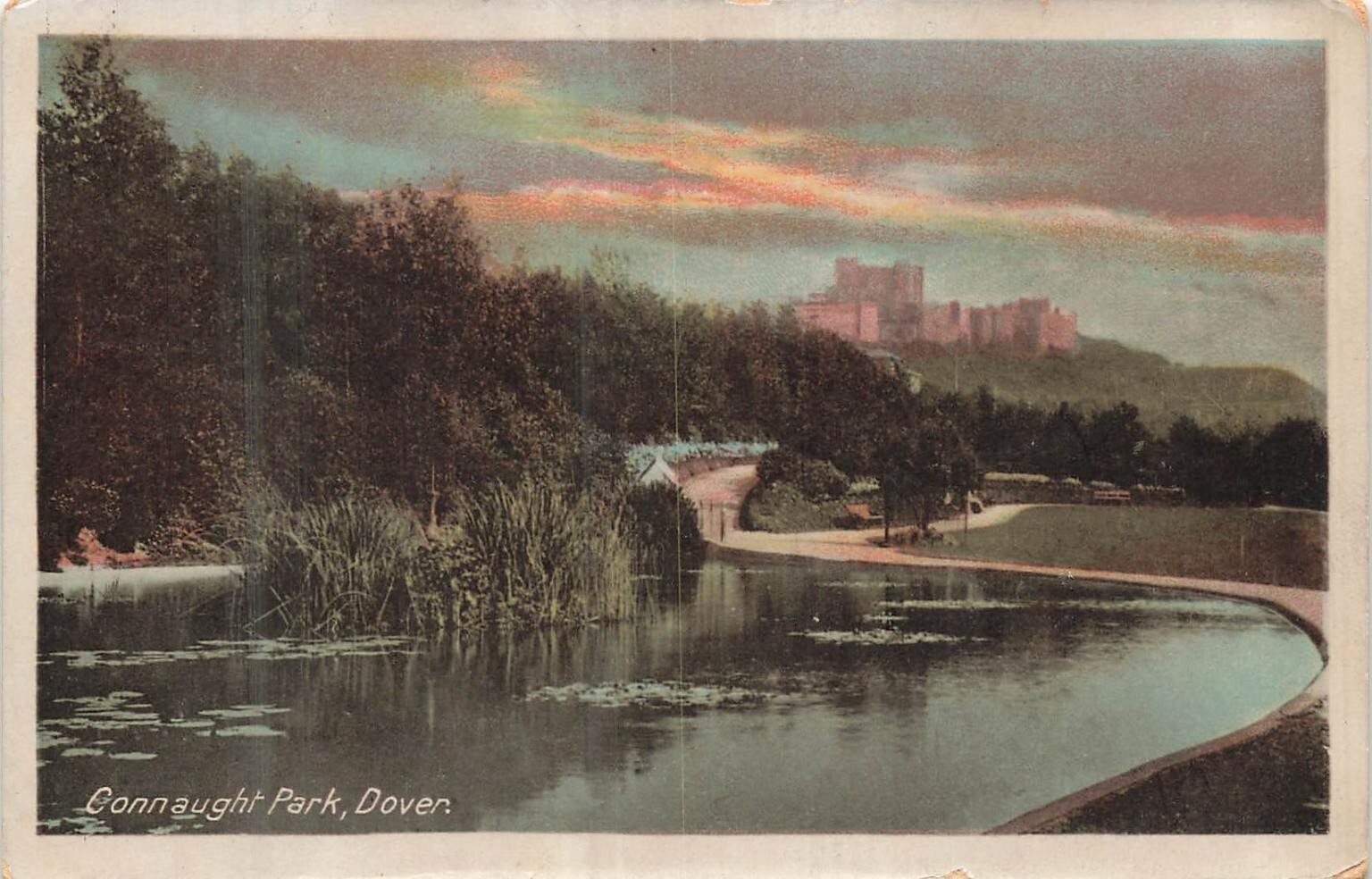 This vintage postcard features a picturesque view of Connaught Park in Dover, Kent, England, with the iconic Dover Castle visible in the distant background under a colorful sky. The image captures a serene pond edged by lush greenery and a gently curving pathway, showcasing early 20th-century park landscaping and the historic castle, a landmark of great geographical and historical significance.Produced by The Milton Post Card Company, this postcard is part of their 'Fac-Simile Sunset' series, known for its distinctive color-tinted printing technique popular during the Divided Back era (1907-1915). The card is a standard size 5.5 x 3.5 inches, printed in England, and bears a green halfpenny stamp with a postmark indicating use. This piece offers collectors a glimpse into Edwardian England's postcard artistry and regional heritage, making it a valuable addition to any collection focusing on British landmarks or early postcard history.