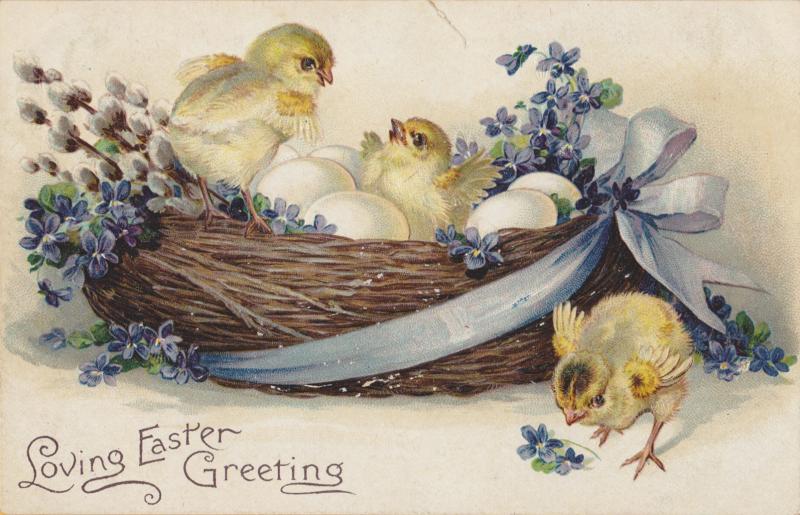 Vintage Easter Chicks Hatching in basket "Loving Easter
