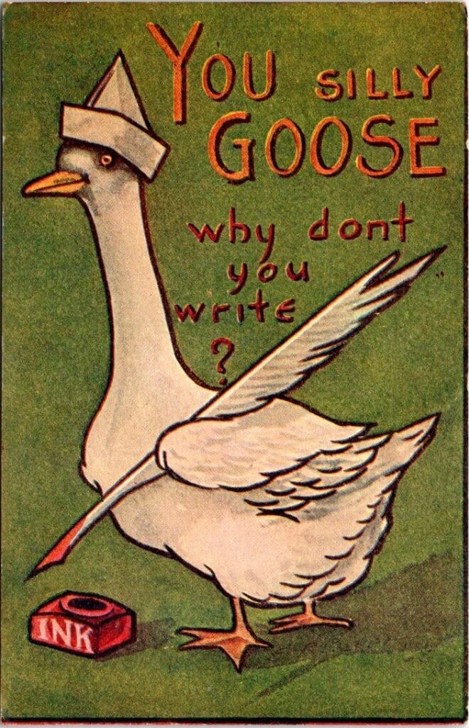 Vintage Greeting YOU SILLY GOOSE~Why Don't You Write? Feather Pen 1910 Postcard