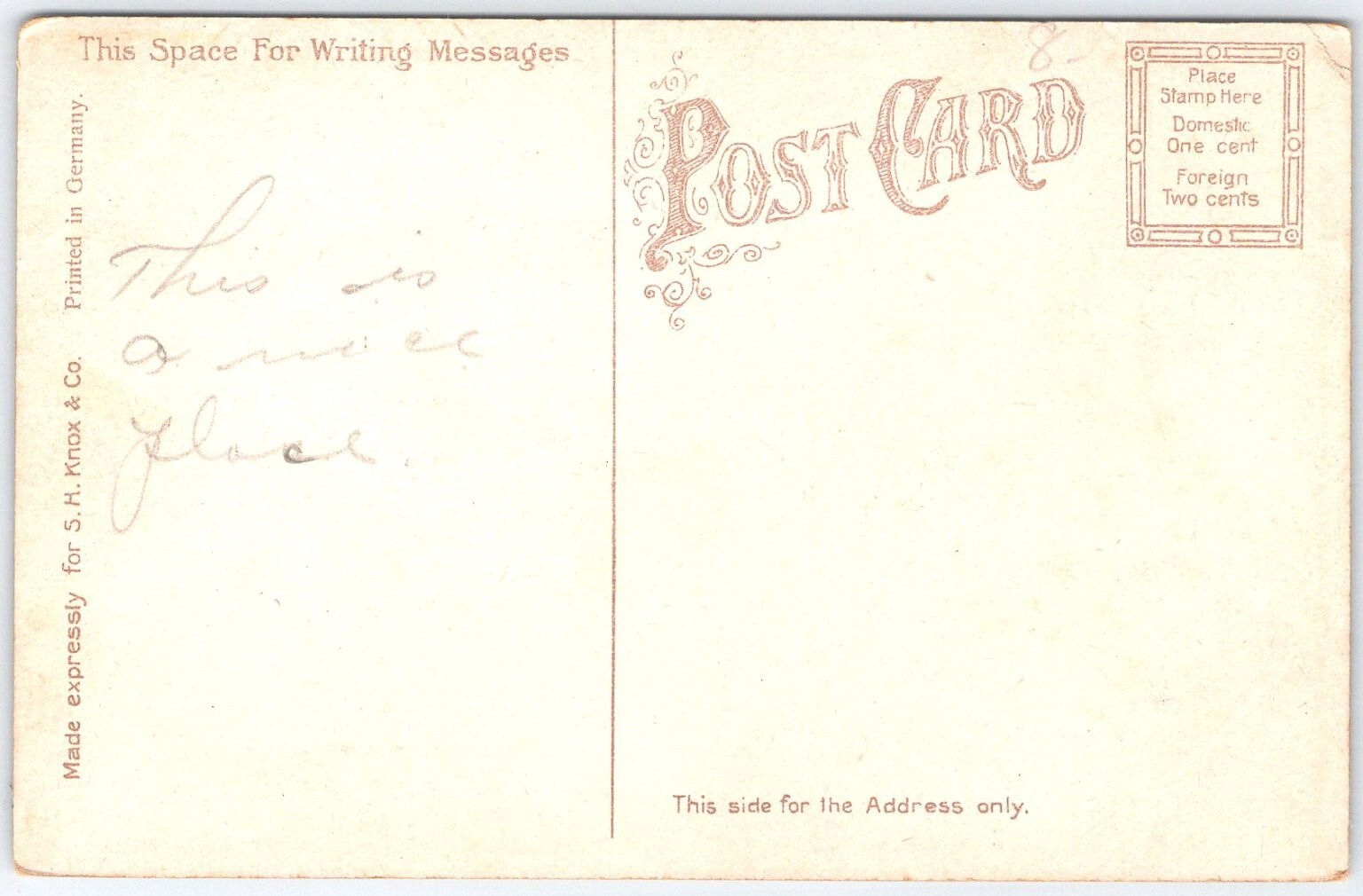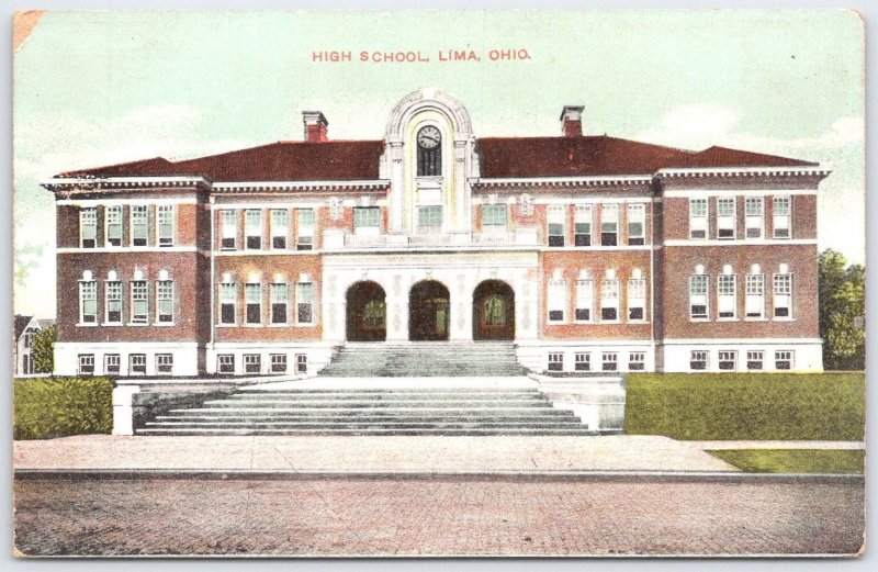 This vintage postcard features a detailed illustration of the historic High School located in Lima, Ohio. The architectural design showcases a grand brick building with symmetrical windows and a distinctive clock tower centered above the main entrance. The postcard is a wonderful example of early 20th-century printing techniques, likely a linen or chromolithograph style common to that era, with soft pastel tones and crisp architectural details.Printed expressly for S.H. Knox & Co. in Germany, this postcard reflects the international production methods of early postcards before World War I. It is a standard-sized paper postcard measuring approximately 5.5 x 3.5 inches, with divided back design allowing space for messages and address. Collectors and enthusiasts of Ohio history or vintage school memorabilia will appreciate this postcard's representation of educational heritage and early postcard artistry.