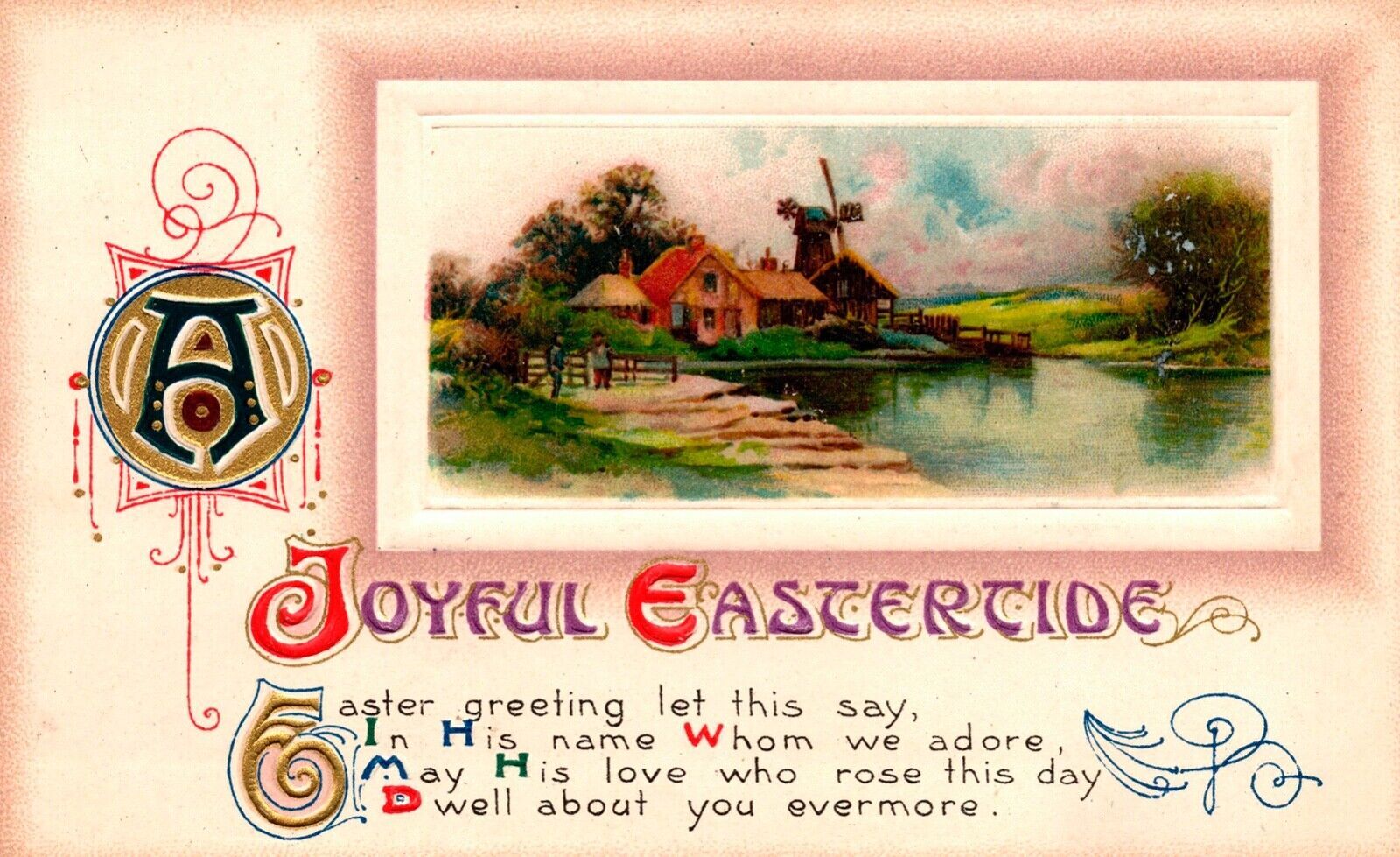 Here for your consideration we have a 1910 John Winsch Easter Postcard featuring a colorful village with cottage and windmill by the river. Postcard is in excellent unposted/uncirculated condition with beautiful litho work and colors.Thanks!