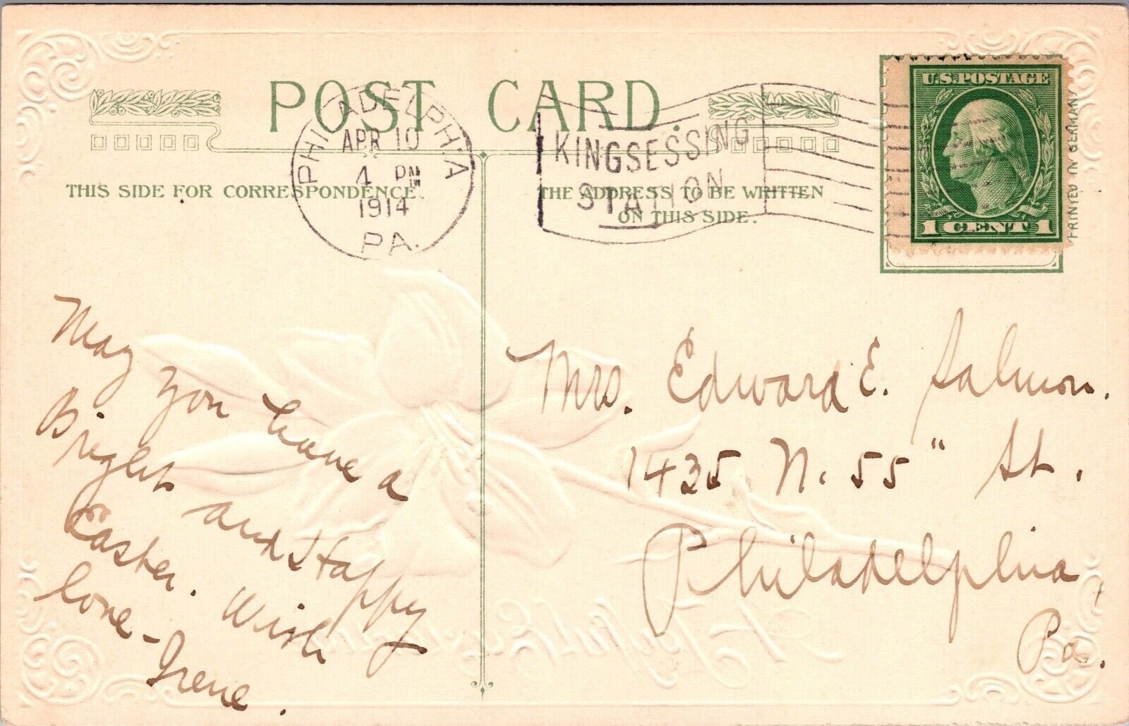 Here for your consideration we have a 1914 postmarked John Winsch Easter Postcard featuring an elegant Lily Flower. Postcard is in excellent condition with superb litho work/colors.Thanks!