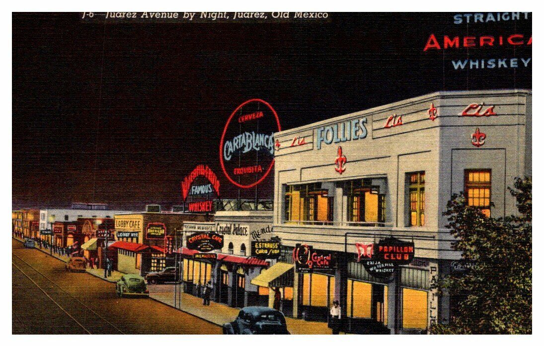 Vintage J-6 Juarez Ave By Night Juarez, Old Mexico showing Straight America Whiskey, Follies, Carta Blanca, Lobby Café, Papion Club, Capital Café.